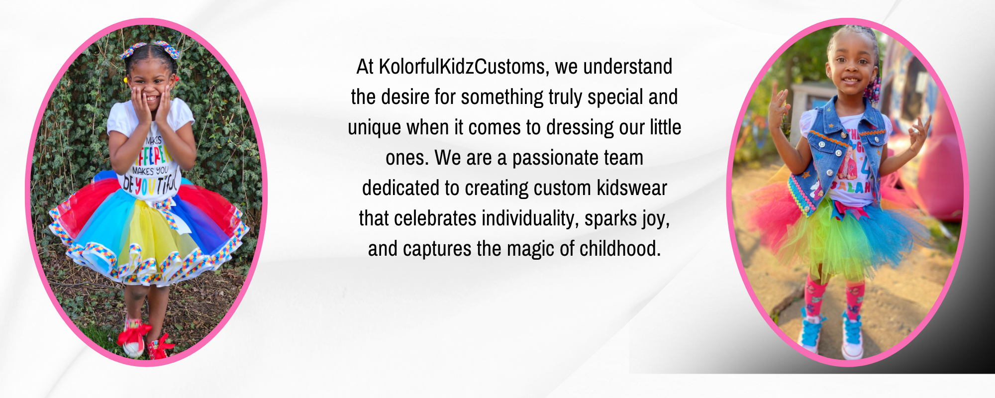 At KolorfulKidzCustoms, our mission is to celebrate the individuality of every child and bring joy to their lives through our custom creations. We believe that childhood is a canvas for imagination, self-expression, and limitless possibilities. With our personalized and handcrafted designs, we strive to empower parents and caregivers to dress their little ones in garments that reflect their personality, dreams, and passions